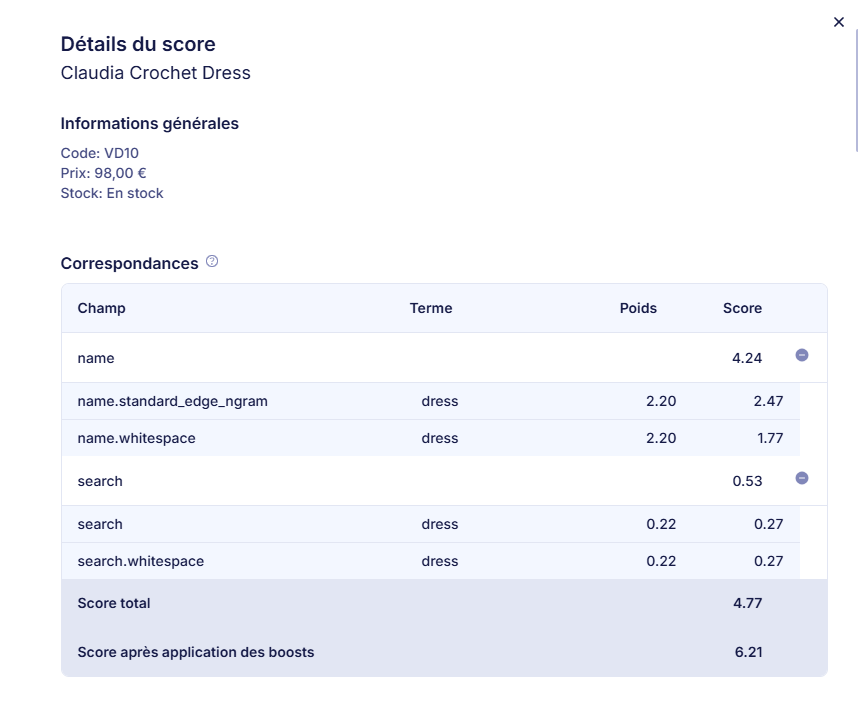 The Explain feature analyzes in detail why a product appears in your search or navigation results. It shows the impact of searched terms, synonyms, indexed fields, relevance score, and merchandising rules (boost, bury, sort, optimizers).