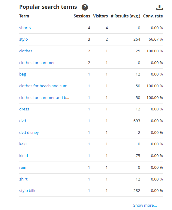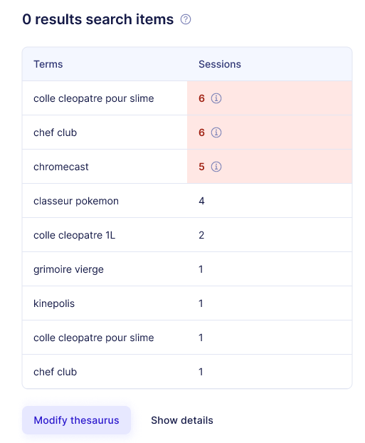 The table of zero-result terms is a true treasure trove of information. It reveals the gaps in your catalog or your thesaurus. You can correct these discrepancies to improve your search coverage.