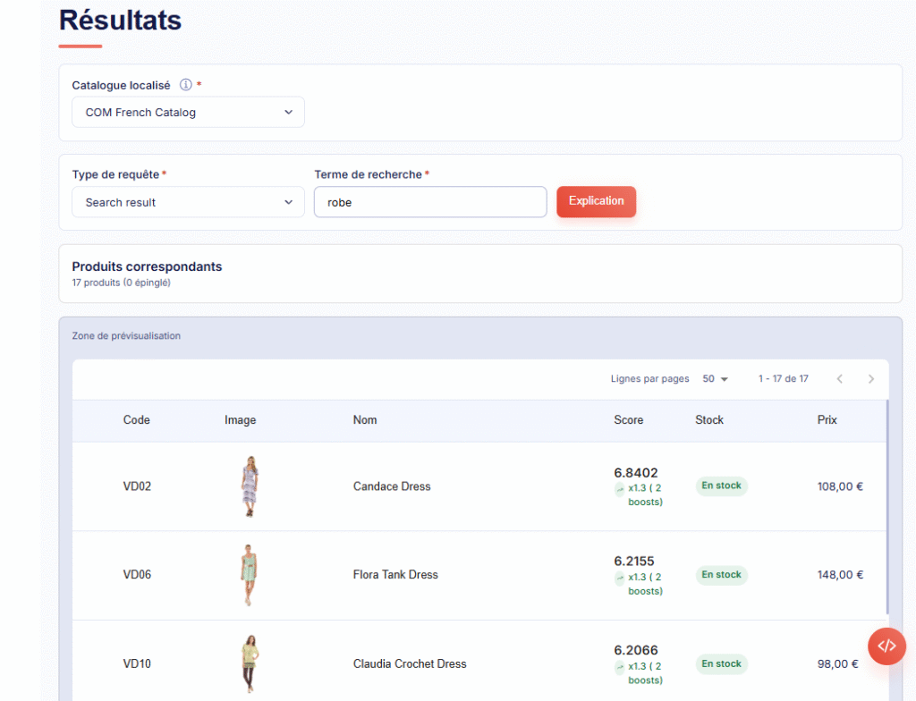 For each displayed product, the Explain feature reveals the exact score that determined its ranking. You get the detail of point attribution (applied boosts, keyword matching, etc.).
