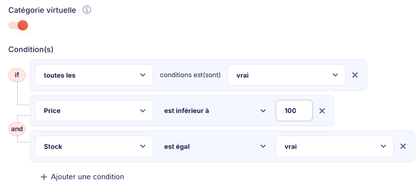 Virtual categories use filtering rules based on product attributes, not a simple text search. The ElasticSuite/Gally engine defines precise criteria (color, price, stock). This approach ensures an instant and reliable list, while applying the merchandising rules.