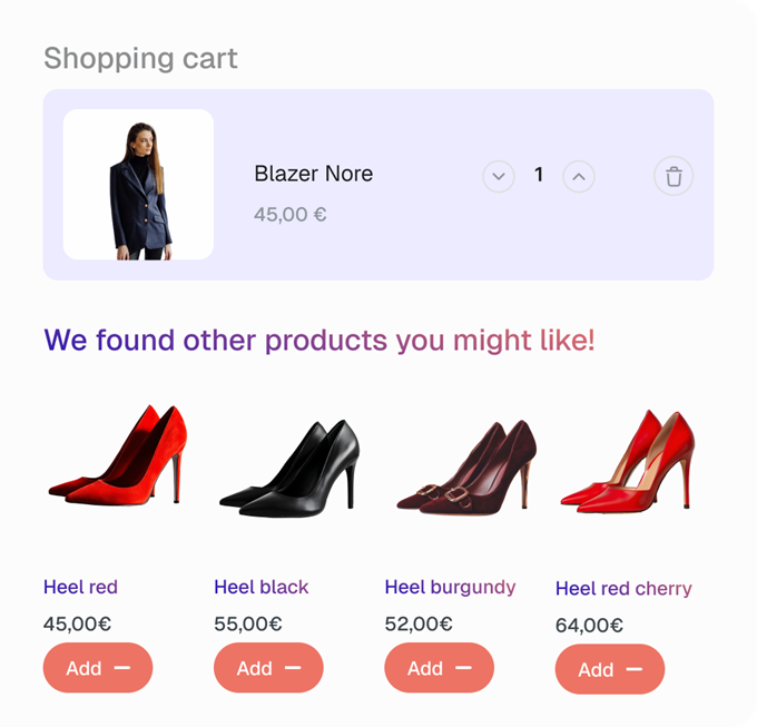 Our engine manages three essential block types for cross-selling and upselling on your e-commerce site: