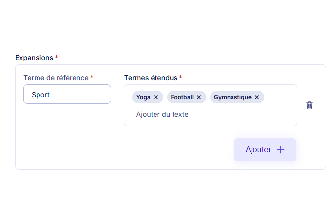 Expansion is a thesaurus rule that maximizes the coverage of search results for a generic term. The goal is to enrich the query before the search execution, without requiring all products to have a generic label. Example: Sport โ Yoga, Football, Gymnastics; when a customer searches for “Sport,” the engine automatically includes products related to these specific terms.