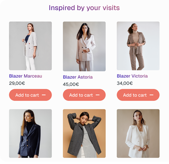 La fonctionnalité de Personnalisation est un widget de suggestions alimenté par l’intention d’achat active de l’utilisateur. Il analyse les produits consultés pendant la session actuelle ou récente et utilise la similarité des attributs (marque, couleur, style) pour identifier et afficher des recommandations ultra-pertinentes. Cette approche augmente le taux de conversion en garantissant que les suggestions correspondent aux intentions immédiates du client.