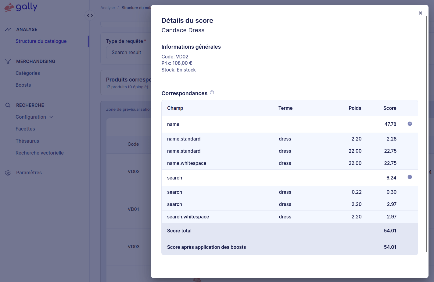 In the previous version we released a new page in the gally backoffice where marchant can preview the results of their configuration. In this version we add the possibility to show the details of how the score of each product has been computed.