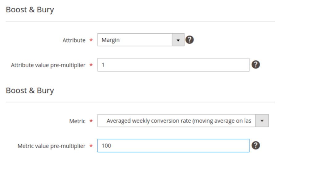 The โBased on attribute valueโ andย ย โBased on behavioral dataโ rely on a per-product value (attribute value or behavioral metric, respectively) to determine their boost.