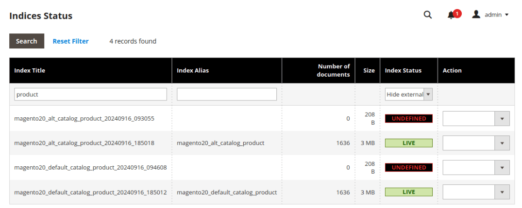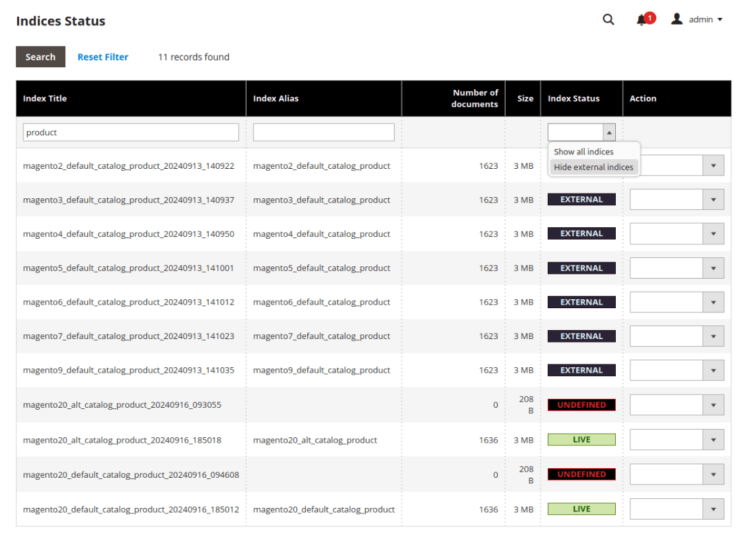 On a UAT or Staging environment where the Elasticsearch/OpenSearch cluster is shared by many Magento instances, it can be cumbersome to locate and inspect your live indices in the Elasticsuite > System > Indices grid if you have to scroll down 5 screens to reach them.